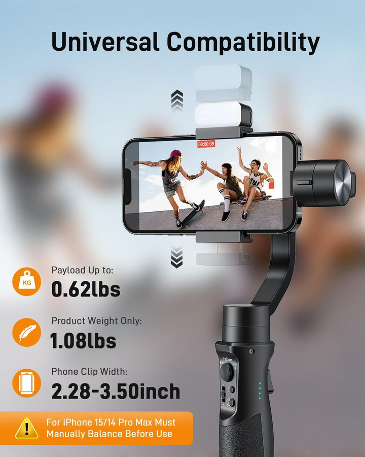 Upgraded iSteady 7.0 Anti-shake: Experience cinema-quality footage with iSteady 7.0 Stabilization, a technology that ensures flawless and smooth footage regardless of your movements. With 20% more motor torque, even larger smartphones like the iPhone 15 Pro Max can be accommodated easily. Get ready to unlock your creative potential. With this 3-axis stabilizer, you can bring your storytelling to a whole new level. Perfect for sports Vlogs, travel videography, and on-the-go content creation.