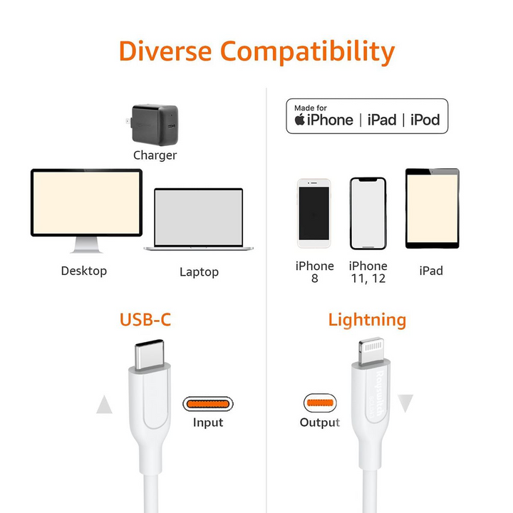 Compatibility: USB-C to iPhone cable supports PD Fast Charge 3A (max) for iPhone 14/14 Pro/14 Pro Max/14 Plus/ iPhone 13/13 Pro/13 Pro Max/13mini/iPhone 12/12 Mini/12 Pro/12 Pro Max/11/11 Pro/11 Pro Max/XS Max/XS/XR/X/8 Plus/8 and iPad 8th iPad 2020, iPad Pro 12.9" gen1/ gen2/iPad Pro 10.5"/iPad Air3 10.5"/iPad mini5 7.9"; Note: You need a USB-C port wall charger to achieve fast charging.